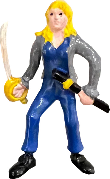Bislang waren fünf verschiedene davon bekannt – die Piratin mit Säbel sowie der Pirat mit Säbel und Pistole, jeweils aus gelbem oder blauem Grundmaterial, sowie der Pirat mit Säbel und Pistole aus gelbem Grundmaterial, das zusätzlich blau übermalt wurde. Die letztgenannte Figur stellte dabei die seltenste Variante dar. Ein aktueller Fund hat hier nun zu neuen Erkenntnissen geführt. Zu dem Fund gehört zum einen die nachfolgend abgebildete Piratin mit Säbel. Beim flüchtigen Hinsehen könnte man zu dem Schluss kommen, es handle sich um die bereits bekannte Figur. Tatsächlich wurde hier aber das gelbe Grundmaterial zusätzlich nochmals gelb übermalt.