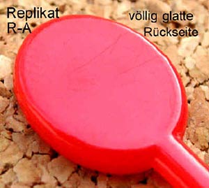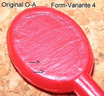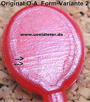 Diese Variante hat weder die gestrichelte Linie noch die Stege am Stiel. Zur Identifizierung kann auch noch eine feine Struktur (Fleck) auf der Rückseite dienen (siehe Bild). Diese feine Struktur ist aber schon schwierig zu finden. Es gibt diese Variante in einer dünneren und einer dickeren Form. Die dünne Form ist üblicherweise mit einem glänzenden weißen Lack dick bemalt. Die dickere Variante ist üblicherweise mit einer dünnen weißen Farbschicht angesprüht. |