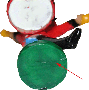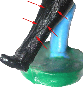Mit diesen zwei Bildern möchten wir auf die doppelte Naht des Dentalreplikates des Trommlers kurz eingehen. Das linke Bild zeigt unter den Sockel ein Stück von einer Naht. Bei dem rechten Bild ist schön zu sehen, wie die doppelte oder sogar dreifache Naht am Bein entlangläuft. | |