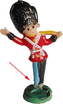 | Von unserem Sammlerkollegen Peter Andrecht wurde uns zusätzlich ein Soldat mit Gewehr und Stab zur Verfügung gestellt, der ebenfalls eine Naht unter dem Sockel hat. Der Soldat mit Naht ist kräftiger bemalt. Die schlaksige Köperhaltung des Grenadiers mit Naht sollte von einer Verformung herrühren. |