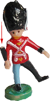 | Dieser Gardegrenadier mit Gewehr ist sehr typisch für eine Wache, die aber nicht still steht, sondern ein Bein nach oben hat, wie bei der Wachablösung oder dem auf und ab Marschieren vor dem englischen Könighaus. Das Gewehr hat am Ende noch ein dünneres Stück, was ein Bajonett darstellen könnte. Die Spitze ist fast so spitz wie eine Stecknadel. Katalogwert 125 Euro. |
