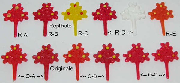 Auf dieser Seite wird das Original und Fälschung vorgestellt von dem Blumenstrauss aus der Serie Erkennst Du Deinen Schlumpf (1981). Auf den Bildern steht der Buchstabe R für Replika und O für Original. Der zweite Buchstabe ist eine Nummerierung A, B, C, D usw. um die Zubehöre dem Beschreibungstext besser zuzuordnen zu können. Alle Bilder können in groß angezeigt werden, indem einfach auf das gewünschte Bild geklickt wird! Blumen des Schüchternen Schlumpfes in der Übersicht: