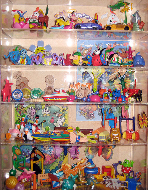 Dieses Bild sieht aus wie ein vollgepropfter Setzkasten, es handelt sich aber um ein Diorama aus dem Jahre 2001. Dieses Diorama beinhaltet das aktuelle Spielzeug aus Japan.