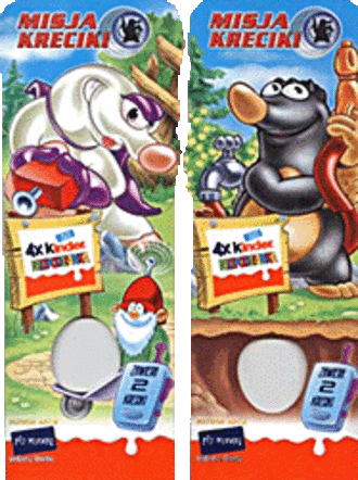 Das Bild zeigt zwei leere 4er Packs zur Misja Kreciki (Mission Maulwurf). Es gibt zwei unterschiedliche Verpackungen. Einmal mit Conny Control und Gartenzwerg mit Schubkarre in der ein Ü-Ei drin ist und die Hauptfigur Mike Mission.