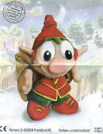 Das Bild zeigt uns einen BPZ von den Weihnachtswichteln aus dem Maxi Ei oder Weihnachtskugeln. Es handelt sich hierbei sicher um eine deutsche Figur, da unten auf dem BPZ "Farben unverbindlich" steht. Vielleicht gibt es ja wieder eine ganze Serie von den Plüsch Figuren. [Quelle: Diese eBay Auktion]