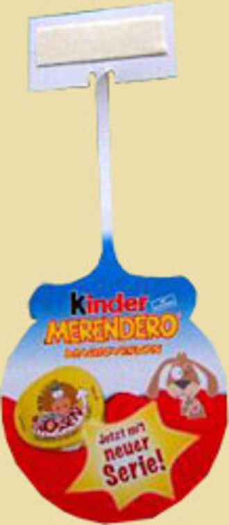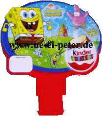 Dieser SpongeBob Anstecker wird oben zwischen die Ü-Eier gesteckt. Abgesehen von der Werbefunktion soll der Anstecker den Preis der Ü-Eier preisgeben. Für Sammler von Werbematerial ist es wichtig, dass kein Preis in dem Anstecker geschrieben wurde, da das eine Wertminderung wäre.