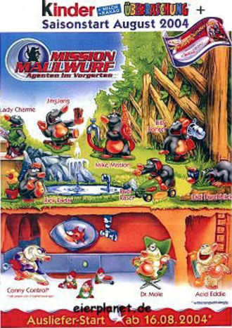 Wieder einmal ist es ein Werbeblatt, welches uns die Namen der Mission Maulwurf Figuren verrät! Hier die Namen von oben links an: Lady Charme, Jing Jang, Rick Radar, Mike Mission, Rudi Raser, Billy Bohrer, Didi Durchblick, Dr. Mole, Acid Eddie und Conny Control. Schön zu sehen sind im unteren Bereich die drei sabotierenden Maulwürfe in hell. Bei Conny Control sind 3 kleine ferngesteuerte Zwerge zu sehen was damit zusammenhängt, dass Conny Control mit drei unterschiedlichen Zwergen ausgeliefert wird. Damit hält Ferrero daran fest, gezielt Varianten zu produzieren. Danke für die Info an Christian!