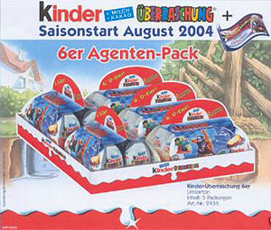 Von der Mission-Maulwurf wird es 6er Packs geben wie das linke Werbeblatt zeigt. Auf dem anderen Werbeblatt ist noch der klassische 72er Theken Display Aufsteller in groß zu sehen. Die Bilder stammen aus einer eBay Auktion. Zur Zeit werden von Ferrero alle Auktionen betreffend der neuen Herbserie gestoppt [Mehr dazu in diesen Bericht des Eierlei Forums], sonst noch der Link zu dieser Auktion [Zur Maulwurf Auktion]. Mal sehen wie lange diese Auktion noch zu erreichen ist!