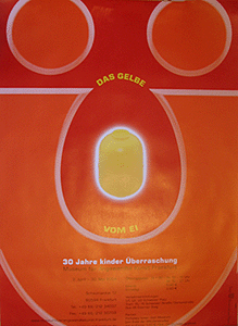 Vom 2. April bis zum 30. Mai wird im Museum in Frankfurt eine Ü-Ei Ausstellung zum 30 jährigen Geburtstag stattfinden. Genau für die Ausstellung wurden A0 Plakate entworfen (siehe Bild links)!Im gleichen Layout werden Informationskarten ausgeliefert. Der Slogan der Werbeaktion lautet "DAS GELBE VOM EI"! Im Mittelpunkt steht symbolisch eins der gelben Ü-Ei Kapseln. Überschrift "30 Jahre kinder Überraschung", Untertitel "Museum für Angewandte Kunst Frankfurt". Auf den Plakaten und Karten sind alle wesentlichen Informationen zu finden wie z. B. die Öffnungszeigen, Eintritt (5 Euro, ermäßigt 2,50 Euro), Führung und das wohl Außergewöhnlichste "Künstlerworkshop für Kinder und Erwachsene" Zitat: 30 Jahre kinder Überraschung. Filz ist Kult[ur]. Handgefilzte Ei-Objekte vermitteln eine harmonische, warme Ausstrahlung und sind stets Unikate. Dieser Workshop findet am 3. April von 10 - 17 Uhr statt (Preis pro Person 50 Euro)! A2 Plakat kaufen auf [eBay] oder im [Shop] [Alle Informationen zur Museumsausstellung in Frankfurt] oder hier [www. museumfuerangewandtekunst. frankfurt. de]