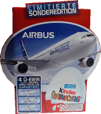 Die Bilder zeigen ein 4er Pack von beiden Seiten. Es handelt sich dabei um die Airbus Flotte A330-300. Pro 4er Pack wird ein Airbus garantiert. Auf der Rückseite sind die 3 Modelle abgebildet und mit technischen Daten versehen. Die ersten Modelle der Serie waren allerdings schon vereinzelt in den August Eiern 2011 enthalten. Wir können beide Sätze der Serie günstig im [Eierlei Shop] anbieten. Auf eBay sind weit über 100 Auktion der Modelle zu finden [Live Suche auf eBay nach Airbus starten]!