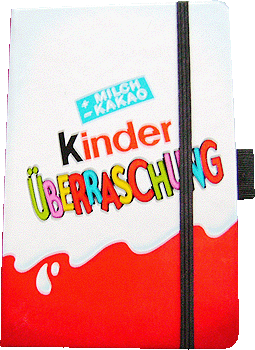 Dieses Notizbuch von Kinder Überraschung scheint sehr selten zu sein oder brandneu. Das Format ist DIN A6. Ein Gummizug hält das Notizheft zusammen und kann als Lesezeichen verwendet werden. Die Notizen werden auf Karopapier geschrieben. Das gleiche Notizheft ist uns schon mal begegnet, aber im Layout der Großstadthunde: Ein Bild davon ist in dieser [alten News der Großstadthunde vom 06. 10. 2010 zu sehen]. Quelle: [osito99. de]