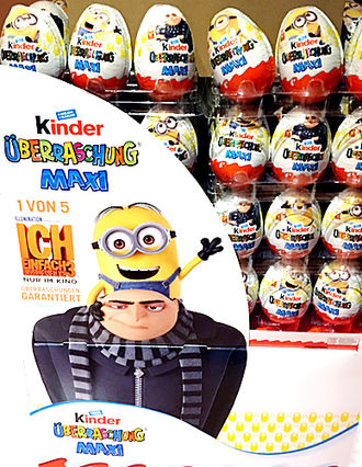 Maxi Eier der neuen Minions"ICH EINFACH UNVERBESSERLICH 3". Dieser Aufsteller wurde in Österreich entdeckt. In jedem 5. Ei steckt eine Figur zum neuen Kinofilm. In den Eiern stecken fünf funktionelle Inhalte. [Zu bekommen in dieser eBay Auktion]