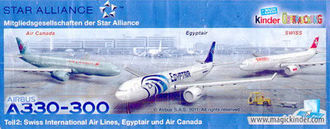 In den neuen Ü-Eiern steckt die zweite Serie der Star Alliance Reihe A330 - 300. Das Bild zeigt uns den Beipackzettel mit den drei neuen Modellen. Hinten rechts auf dem BPZ ist die Swiss Air zu sehen. Diese beiden Bilder zeigen die Egyptair und Air Canada. Die Flugzeuge sind wieder auf einem Sockel und zu jedem Flieger gehört ein Airbus Aufkleber. Star Allianca Teil 1 im [Ü-Ei Shop]. Live Suche auf eBay nach Airbus starten: [START]