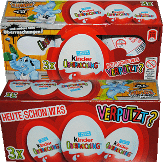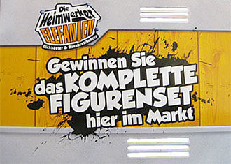 Bei Aldi Süd in Freiburg wurde von Florian L. dieses 3er Pack entdeckt. Der Preis pro 3er Pack ist 1,75 Euro. Eine Figurengarantie gibt es nicht, aber es waren in fünf gekauften 3er Packs 3 Figuren der Heimwerker enthalten. Das Design vom 3er Pack ist sehr knallig rot und auf oben auf dem Deckel und auf der Rückseite sind drei Ü-Eier abgebildet. Auf dem 3er Pack herrscht das Motto "Heute schon was VERPUTZT?".