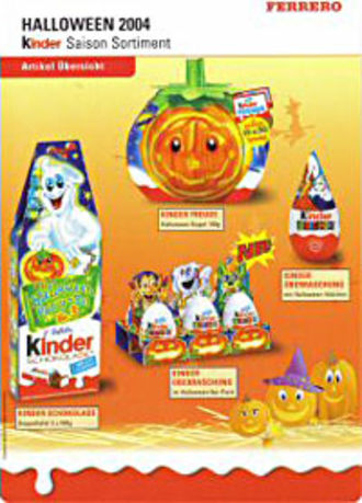 2003 waren 6er Packs von Halloween erschienen, leider war es nur begrenzte Testware! Diese Werbeblätter zeigen, dass die 6er Packs zum Sortiment gehören. 2004 dürfen wir uns erneut auf Ü-Eier auf Halloween Hütchen freuen, genauso wie auf die großen Halloween Kürbisse. Das Werbeblatt rechts zeigt einen Turm mit den neuen 6er Pack Halloween Ü-Eier. Auf jedem Werbeblatt steht "Gestaltungsänderungen vorbehalten". [Ersteigerungsmöglichkeit der WB auf eBay]