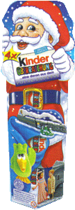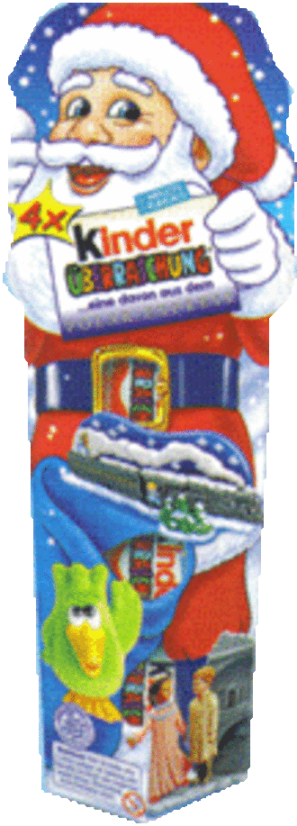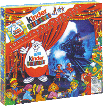Dank einer eBay Auktion ist jetzt schon anhand erster Werbeblätter (WB) bekannt geworden, was uns Weihnachten 2004 erwartet! Alle gezeigten Bilder wurden zu besseren Ansicht ausgeschnitten und vergrößert. Auf dem WB zu sehen sind 4er Packs als Weihnachtsmänner und Schneemänner. Versprochen wird, dass in jedem 4er Pack ein Polar Express Inhalt enthalten ist! Zu den 4er Pack Türmen wird es einen PAH geben (siehe Bild rechts). Der PAH zeigt den Polar Express. Es wird auch Hüttchen vom Polar Express geben, wo wahrscheinlich die gleichen Inhalte wie bei den Weihnachtsmännern drin sind. Was ist der Polar Express? Der Polar Express ist der kommende Weihnachtsfilm mit Tom Hanks. Wir schätzen, dass die Polar Express Ü-Eier ähnlich wie die Halloween Ü-Eier sein werden, also mit besonderen Inhalten auf den Film bezogen! Das es eine Serie mit 10 Figuren wird kann sein, denken wir aber nicht! [Zur Polar Express Auktion]