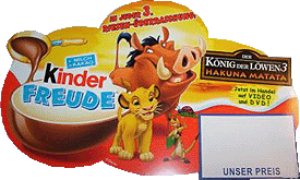 Auf dem Bild zu sehen ist der PAH der kommenden Maxi Eier (Kinder Freude). Im Mittelpunkt stehen die Hauptdarsteller, das Besondere steht aber über den drei in roter Schrift "IN JEDEM 3. RIESEN-ÜBERRASCHUG"! Das sollte im Klartext heißen, dass in jedem 3. Maxi Ei ein Inhalt von König der Löwen sein wird. Die ersten Artikel von König der Löwen werden schon auf eBay angeboten, darunter ist z. B. ein Handtuch, Geduldspiel (Heiße Draht) und weitere werden folgen! [Zur PAH Auktion] [Zur Handtuch Auktion] [Zum Geduldspiel]