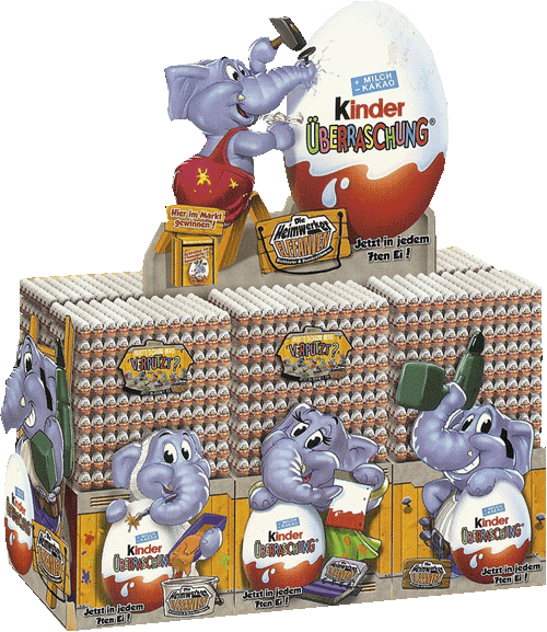 So werden uns die Dickhäuter & Dünnbrettbohrer entgegentreten. Das Gebinde ist interessant gestaltet. Oben ist ein Pappaufsteller mit Losbox. Toni Tolpatsch schlägt gerade einen Nagel ins zerbrechende Mega Ü-Ei. Das Gebinde zeigt PAH, was aber keine Garantie ist, dass es die PAH in dieser Art und Weise geben wird. Auf den PAH steht der zweideutige Spruch "Heute schon was verputzt ?". Vor jedem Aufsteller ist ein anderer Elefant in Großformat zu sehen. Danke an Hans Dieter für die Bilder. [Diese eBay Auktion]. Auslieferungsstart ist der 8. 8. 2011. [Live Such auf eBay nach den ersten Heimwerker Auktionen]