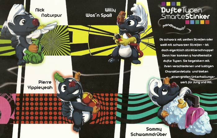Auf diesen großen Werbeblättern von Ferrero sind die Namen der Stinktier Serie zu entnehmen. Die Figuren scheinen dunkelgrau / weiß bemalt zu sein. Die Namen passen wieder sehr gut und machen die Figuren sympatisch. Der Satz besteht aus 9 Figuren und kommt nach der August Serie ins Ü-Ei. Die Figur "Fernada Feurig" könnte Fernanda Brandao darstellen, nur wer ist dann Dieter Bohlen ;-) Danke an Hans Dieter für die Bilder. Quelle: [Diese eBay Auktion]