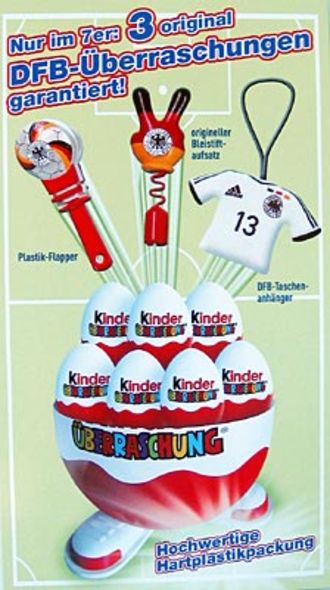 Im März kommt eine Sonderverpackung zu der neuen Serie. Die Sonderverpackung ist ein Ü-Ei, wo sich 7 Ü-Eier drin befinden. Schaut sehr gut aus, aber noch besser ist, dass in den Ü-Eiern 3 original DFB Überraschungen garantiert werden. Dabei handelt es sich um ein Plastik-Flapper als Ball, einen Bleistift-Aufsatz und einen DFB Taschenanhänger (siehe links). Rechts sind vier der 7er Sonderverpackungen zu sehen, so wie sie uns im Supermarkt entgegen treten werden :-)
