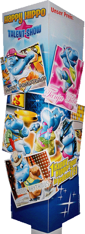 Die Neuigkeiten über die Happy Hippos reißen nicht ab. Das Bild zeigt den Kantenschoner von der Happy Hippo Talent Show Serie. Der Kantenschoner dient dem Zweck, dass die empfindlichen Ü-Eier auf dem großer Bodenaufsteller nicht vom Einkaufwagen beschädigt werden. Gleichzeitig wirbt der Kantenschoner mit der aktuellen Hauptserie aus den Ü-Eiern. Auf dem Kantenschoner sind sechs der Talent Show Hippos zu sehen. Sogar die Kantenschoner werden gesammelt. Hierbei ist darauf zu achten, dass kein Preis auf den Kantenschoner geschrieben wurde, so wie auf dem Bild oben rechts zu sehen. Danke für das Bild an Andy_Q Es gibt ein weiteres Video von den Talent Show Hippos. In diesem Video werden die Kandidaten vorgestellt und am Ende mit Vote Nummern gezeigt. Dazu läuft der neue Song von Stefanie Heinzmann "Stop". Quelle: [Video auf Youtube ansehen]
