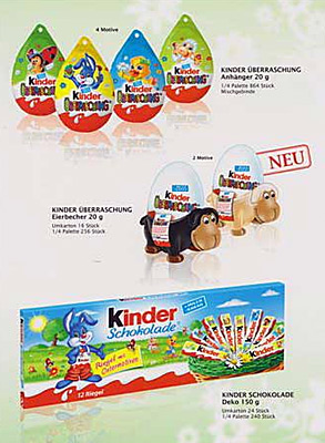Auf diesen Werbeblättern wird präsentiert, wie umfangreich das Ü-Ei Oster-Sortiment von Ferrero ist. Das erste Werbeblatt zeigt oben vier unterschiedliche Ü-Ei Umverpackungen. Jedes der österlichen Ü-Eier hat eine Öse zum Aufhängen. In der Mitte sind zwei Schafe oder Osterlämmer, die sich als Eierbecher nützlich machen. Zu jedem Lamm gehört ein Ü-Ei. Am Ende des Werbeblattes ist noch eine 150g Tafel Kinder Schokolade. Ein knalliges MAXI Ei ist auf dem zweiten Werbeblatt oben rechts zu sehen. Weiter geht es mit Kinder JOY Eiern, die zu zweit in Eierpackungen stecken. Auf dem letzten Werbeblatt ist das bekannte Ostermalset mit 4 Kinder Überraschungen abgebildet.