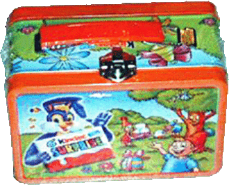 Diesen Blechkoffer gibt es in zwei unterschiedlichen Motiven. Der Koffer ist in einer dünnen Plastikfolie eingeschweißt. Die Bilder vermitteln den Eindruck, dass der Koffer nach dem Verzehr der Ü-Eier praktisch genutzt werden kann. [Link zur Auktion des Koffers]