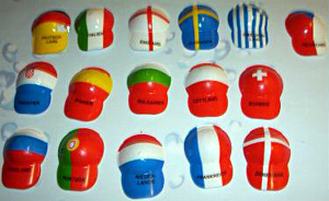 Insgesamt gibt es 16 unterschiedliche Caps, genau von jedem Teilnehmerland ein Cap. Das Cap stellt die Nationalflagge des Ladens dar. Vorne auf dem Cap steht noch in schwarzer Schrift der Name des Landes. In den Eiern sind Figuren der Motocoyoten, Puzzle und Schreibtischbande Figuren! [Link zu einer eBay Auktion mit den EM Caps]