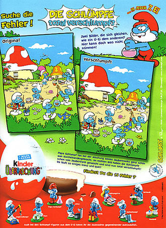 In der Comic Zeitschrift "Leserabe" haben wir diese schlumpfige Werbung entdeckt. Unter dem Motto "Suche den Fehler" soll herausgefunden werden, welche Unterschiede auf dem original Bild und dem verschlumpften Bild sind. Wieder eine interessante Anzeige, die nicht nur überblättert wird, sondern aktiv zum Mitmachen überredet. Wir gehen davon aus, dass die Werbung in noch mehr Comics auftauchen wird. [Zu den Schlümpfen im EIerlei Shop]