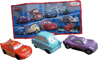 In der Ukraine ist jetzt die Serie "Cars 2" von Disney Pixar rausgekommen. Die Cars stecken in den Kinder Joy Eiern. Der Satz besteht aus 9 Autos. Hinzu kommt noch dieser serienbezogene Spielzeugsatz von Cars 2. Der Satz besteht aus 7 Spielzeugen.