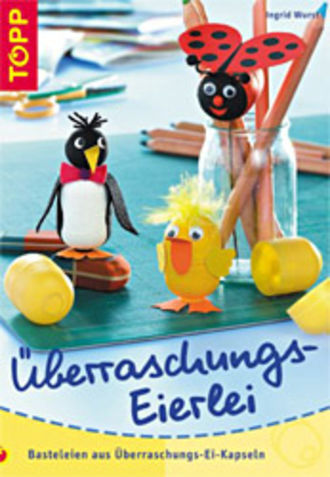 Ende des Jahres 2003 ist diese Heft "Überraschungsei-Eierlei" herausgekommen (es hat nichts mit Eierlei. de zu tun). Das Heft ist eine Bastelanleitung wo drin beschrieben wird, wie aus den gelben Ü-Eier Kapseln schöne Sachen gebastelt werden können. Gerade für die Osterzeit finden sich tolle Bastelanleitungen wie Osterkörbchen aus den Ü-Ei Hälften gemacht werden oder niedliche Küken sowie Osterhasen, Osterglocken als Mobile usw. [Direkter Link zu Amazon wo das Heft für 7,50 Euro zu bekommen ist]