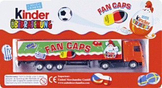 Die beiden Bilder zeigen den Ü-Ei Truck von beiden Seiten, unterschiedlich sind jedoch die Motive der Verpackung. Der Truck wird ziemlich wahrscheinlich parallel zu den Ü-Eiern mit den EM Caps erscheinen, da er für die EM Caps und damit den aktuellen Ü-Eiern wirbt. Wo und ob es ihn zu kaufen gibt ist ungewiss. Mit diesem Truck erscheint der zweite Ü-Ei Truck. Der Ü-Ei Truck aus dem Vorjahr wird jetzt schon mit ca. 10 Euro gehandelt und hat damit eine erachtlichte Wertsteigerung hingelegt. Danke für die Info und Bilder an den Platzbecker Verlag!