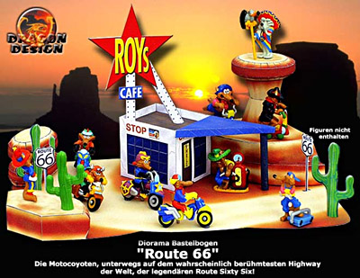 Ab 1. März 2004 ist der Bastelbogen zur Serie „Die Motocoyoten“ lieferbar (Bestellungen sind ab sofort möglich)!. Der Bastelbogen hat den passenden Titel „Route 66“! Mit der Gestaltung hat Dragon Design wieder einmal einen Top Bastelbogen auf den Markt gebracht, wo alle Figuren gut untergebracht sind. Die Auflage ist auf 2. 500 Exemplare limitiert und durchnummeriert. Mehr dazu in dieser Auktion, wo der Bastelbogen für den Preis von 9 Euro "sofort kaufen" zu bekommen ist. [Zur eBay Auktion]
