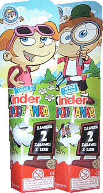 Hier ein 72er Display von den Spring Showers. Das Thekendiplay stammt aus England. In Deutschland wird es den Satz geben mit dem Namen "Die Regenbogen-Strolche". Ein italienisches Werbeblatt zu den neuen Figuren gibt es in diesem [Eierlei Bericht]. Als Hauptserie gibt es jetzt in Hong Kong die Skater Kids. Das Bild zeigt das 3er Pack der Figuren. Eierwiki. de In Mexiko gibt es dieses farbenfrohe 2er Pack. Die Inhalte sind leider aus der uns bekannten Spielzeug Kollektion 2009. Im gleichen Design gibt es auch noch ein 1er Pack aus Mexiko.