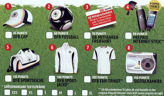 Die Prämien sind als Fanartikel zur Europa Meisterschaft 2012 gedacht. Oben links geht es los mit einem DFB Cap für 45 Punkte, am meisten Punkte werden für die Digitalkamera benötig mit 150 Punkten. Pro Ü-Ei gibt es einen Punkt, auf allen anderen Schoko Produkte und Tic Tac gibt es wie in den letzten Jahren mehrere Punkte zum Sammeln.