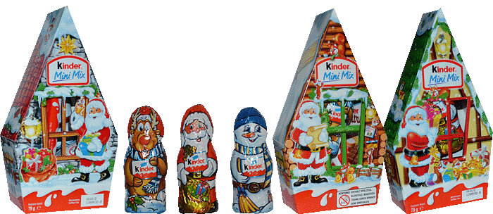 Von dem Kinder Mini Mix Sortiment gibt es drei unterschiedliche Motive. Im Mini Mix ist ein Kinderüberraschungsei, ein Kinderriegel und eine von den drei kleinen Schokofiguren, die aus Ü-Ei Schokolade ist.