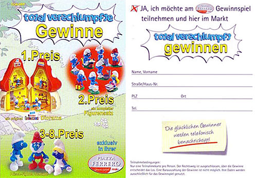 In den Filialen, wo der große Piazza Ferrero Stand aufgebaut ist, gibt es diese Gewinnkarten. Mit der Karte kann am Gewinnspiel teilgenommen werden. Die Preise sind: 1. Schlumpf Diorama 2. Ein Satz Schlümpfe und vom 3. bis zum 8. Platz gibt es einen von den großen Plüsch Schlümpfen. Im Eierlei Shop sind eine Menge neue Ü-Ei Artikel hinzugekommen. Es wird die ganze Bandbreite angeboten von Spielzeug 2008 bis zu absoluten Ü-Ei Raritäten. [Zum Shop] [Die Schlümpfe] [Schafe] [Varianten] [Sonderangebote] [Raritäten] [Ü-Ei Wühlkiste] [Sätze Deutschland]