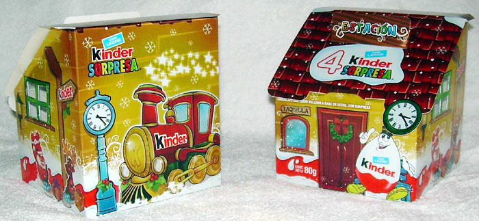 Auf dem Bild zu sehen ist eine Bahnstation "ESTACION" im Weihnachtsflair. Die Bahnstation ist ein 4er Pack Ü-Eier. Es werden sogar 2 Figuren pro Bahnstation garantiert. Das einer Pack, unten zu sehen, ist typisch für Mexiko. Es enthält neben dem aktuellen Spielzeug die alt bekannten Schmuse Gorillas. Rechts ist eine 150g Christmas Kugel zu sehen. In der Kugel könnte der abgebildete Eisbär stecken. Das erfreulichste Highlight für die Mexikaner dürfte dieses 3er Pack der Kung Fu Panda Serie sein. Danke für die News an MEX_EI