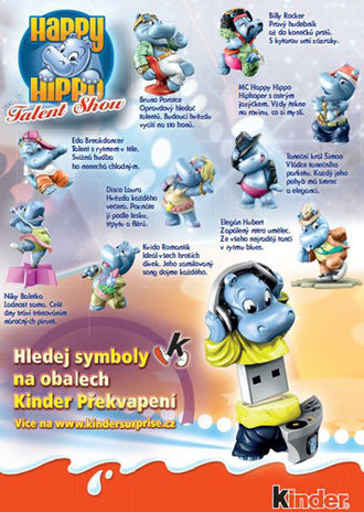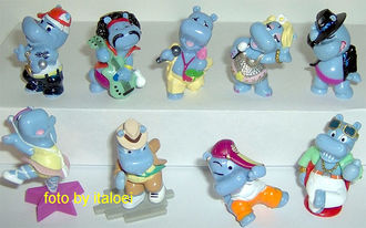 Hier ein gutes Foto von den Figuren der Happy Hippo Talent Show. Die Figuren sehen cool, skurril, glamourös, fetzig, schnulzig oder einfach genial aus. Die Serie wird am 12. 10. ausgeliefert und bis Dezember im Ü-Ei sein. Angebot bei eBay Dies ist der Happy Hippo BPZ, aber aus der Slowakei.