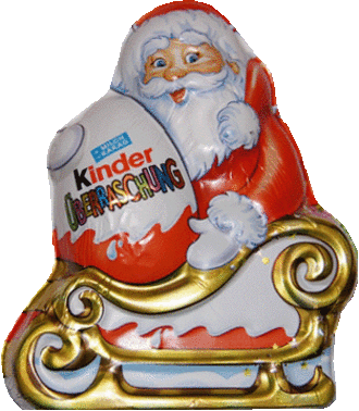 Brandneu ist dieser Schokoweihnachtsmann aus 75 g Schokolade. Die Besonderheit ist das Ü-Ei, welches er in der Hand hält. Das Ü-Ei soll anzeigen, dass in dem Schokoweihnachtsmann eine Überraschung steckt. In den Ü-Eiern könnten die "Die fliegenden Weihnachtsboten" sein. Die Figur ist 12 cm hoch, 11 cm breit und ca. 4 cm tief. Wahrscheinlich handelt es sich hierbei um deutsche Testware. Quelle und zu bekommen in: [Dieser eBay Auktion]