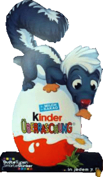 Diese Art riesen Pappaufsteller kennen wir schon vom Küchenduell. Dieser aktuelle Aufsteller von der Serie "Dufte Typen und Smarte Stinker" zeigt Nick Naturpur. Nick versucht die Blume zu pflücken. Der Aufsteller ist selbststehend. Um ein Größenvergleich zu haben, ist unten rechts eine Ü-Ei Kapsel abgebildet. Insgesamt gibt es drei unterschiedliche Aufsteller der Stinktiere. Zu sehen in [Dieser eBay Auktion].
