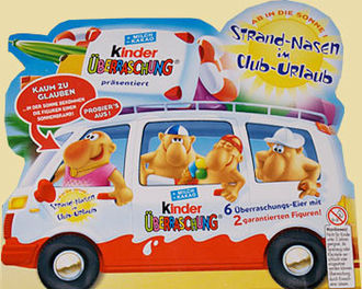 Von den Strandnasen wird es das 6er Pack auf dem linken Bild geben. Das 6er Pack ist ein Tourbus mit dem die Strandnasen fahren und der Eiermann sitzt oben auf dem Bus. Das rechte Bild zeigt, dass die Figuren sich verfärben. Der Slogan lautet "Jetzt wird\'s HEISS" Quelle: [Diese eBay Auktion]