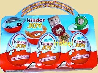 Aus der Schweiz kommt dieses 3er Pack mit Kinder Joy Eiern. Die Verpackung gibt 4 Inhalte preis, aber leider ist nichts von Shrek zu sehen. In Italien gibt es die Zuckertüten von Mission Maulwurf. Die andere Seite zeigt ein Kinder Merendero Ei. Die beiden dreier Packs rechts sind in Australien erschienen. Die Hauptserie ist die Babyfeuerwehr.