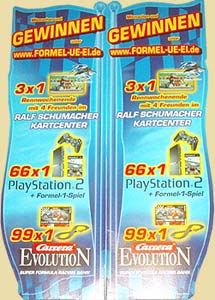 Das Bild zeigt uns einen Kantenschoner der Formel Ü-Ei. Geworben wird für das Gewinnspiel der Formel Ü-Ei. Als Hauptgewinn gibt es gleich 3 mal ein "Rennwochenende mit 4 Freunden im Ralf Schumacher Kartcenter". Für Platz 2 gibt es 66 mal eine Play Station 2 mit Formel 1 Spiel, Platz 3 sind 99 mal eine Carrera Bahn. Teilgenommen werden kann an dem Gewinnspiel auf www. formel-ue-ei. de.