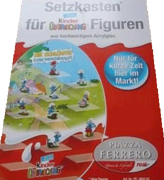Seit Anfang des Jahres gibt es zu jeder Hauptserie diesen Setzkasten. Der Hintergrund wird auf die aktuelle Serie angepasst. In dem eiförmigen Setzkasten werden kleine Acrylglasscheiben eingesteckt, wo die Figuren drauf stehen können. [Live Suche auf eBay nach den Schlümpfen 2008 starten].