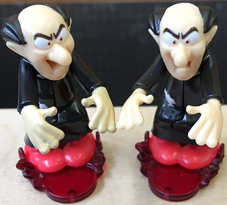 Auf dem Foto ist eine Variante von Gargamel mit bemalten Händen (linke Figur) zu sehen. Bis jetzt waren nur Gargamels mit unbemalten Händen bekannt.