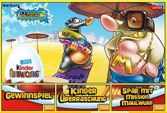 Auf Kinderueberraschung. de kann man seit heute auf das grüne Schild mit der Aufschrift "Das große Mission Maulwurf Gewinnspiel ab dem 21. 08. 06" klicken und kommt dann auf toggo. de zu dieser Auswahl (siehe Bild)! Dort kann man an einem Gewinnspiel teilnehmen, bei Kinder Überraschung kommt nur ein Bild und bei Spaß mit Mission Maulwurf ist richtig was los. Es kann einem Spiel beigetreten werden oder ein schönes Poster von Mike Mission runter geladen werden und zu guter letzt können alle Figuren zur Serie in einer Art Diaschau angeschaut werden.