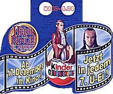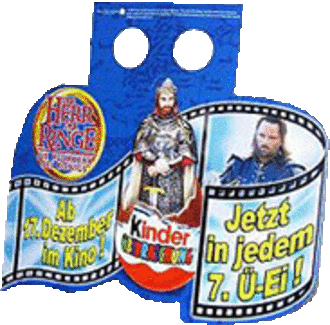Laut unserer Recherche startet Ferrero heute die TV Werbespots zu den neuen Herr der Ringe Figuren, Laufzeit 6 Wochen. Besonderer Leckerbissen sind die Herr der Ringe Filmsequenzen, die schon kurz Freitag morgen auf Sat1 gezeigt wurden. Die 9 Figuren werden in jedem Spot unten eingeblendet. Wir hoffen Euch in Kürze die Spots hier zeigen zu können. Eierlei bei Sat1 [Hier mehr dazu]