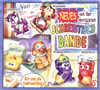 Der neue Satz der Schreibtisch-Bande besteht aus 6 funktionsfähigen Figuren. Der BPZ zeigt oben links zwei Büroklammern mit den Namen "Miauklemm" und "Wauklemm" (ähnlich wie Hip und Hop Clip, nur als Hund und Katze). Wir schätzen, dass sie beide in einem Ei sind. Mitte links ist "Rubbergam", der gerade am radieren ist. Neben Rubbergam ist Filzi Dog, Funktion noch ungewiss. Die beiden Buntstifte unten rechts heißen "Stummel Stift" und "Bella Bunti". Dieser BPZ stammt aus der kommenden Sonderverpackung von Herr der Ringe III. Um den Satz einzuordnen würden wir sagen, dass er mit den "kleinen Giganten", "Faszination fremde Länder Asien" oder "Ist die Katze aus dem Haus" zu vergleichen ist. Mehr dazu in Kürze!