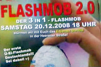Leider haben wir erst jetzt von der ersten Ü-Ei FLASHMOB Aktion Wind bekommen, trotzdem möchten wir über diese gute Aktion berichten. Am 20. 12. wurde das E-Center in Stendal von vielen Flashmobbern gestürmt ;-) Gekauft wurden 1675 Ü-Eier. Diese Ü-Eier sind dann an ein Kinderheim und Kindergarten verschenkt worden. Gerne hätten wir diese Aktion über Eierlei unterstützt - vielleicht beim nächsten Mal. Das ganze Specktakel wurde auf Video festgehalten: Direkt zum Video [Ü-Ei Flashmob]